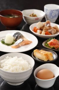 Daily Egg Dish(Scrambled eggs or fried eggs), Grilled fish, miso soup, etc…